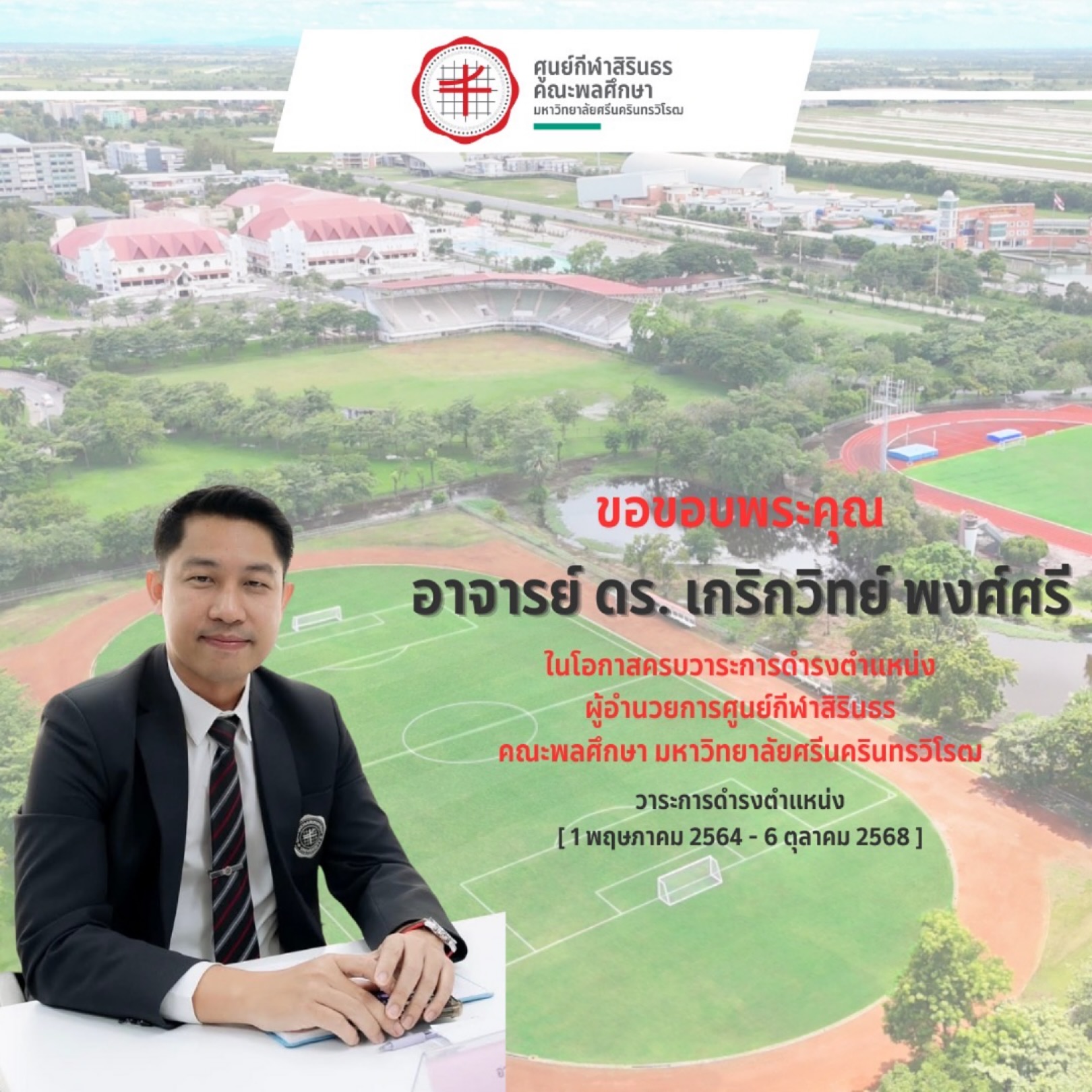 💐 The Sirindhorn Sports Center, Faculty of Physical Education, Sports and Health (PESH), Srinakharinwirot University (SWU), would like to express its sincere appreciation to Lect. Dr. Krirkwit Phongsri on the completion of his term as Director of the Sirindhorn Sports Center, PESH, SWU (May 1, 2021 – October 6, 2025).