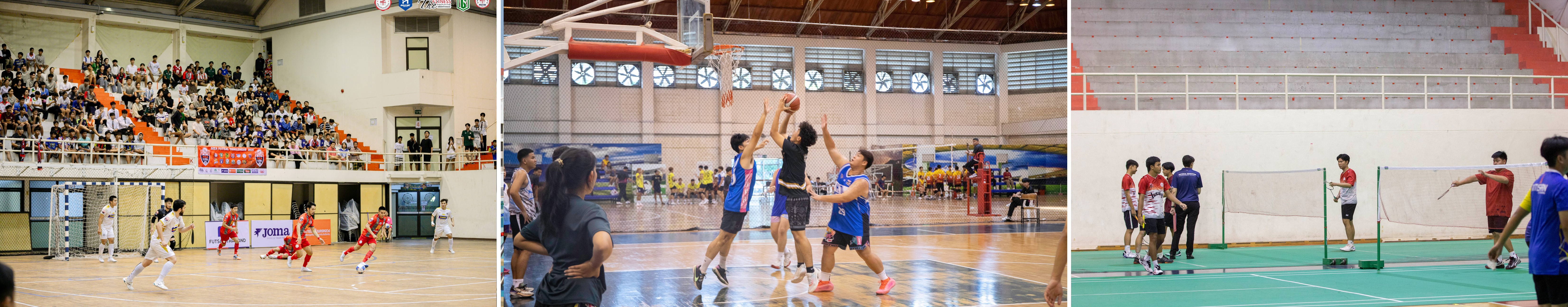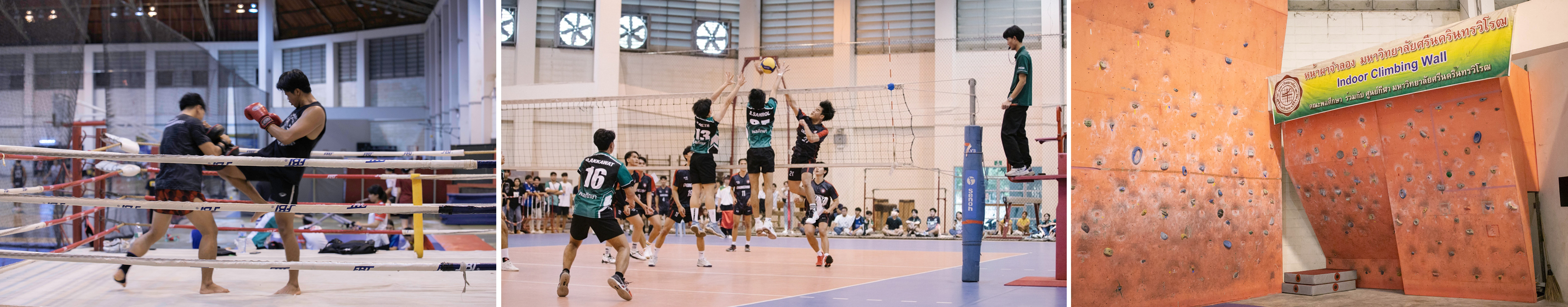 Sports Building 3: Sports Building 3 is a standard multi-purpose indoor sports complex covering a total area of over 4,500 square meters. The facility features a 2,242-square-meter resilient parquet floor and accommodates volleyball, basketball, futsal, and sepak takraw courts. It is also equipped with a climbing wall for sport climbing, a gymnastics area, and designated spaces for boxing, Muay Thai, taekwondo, and judo training.