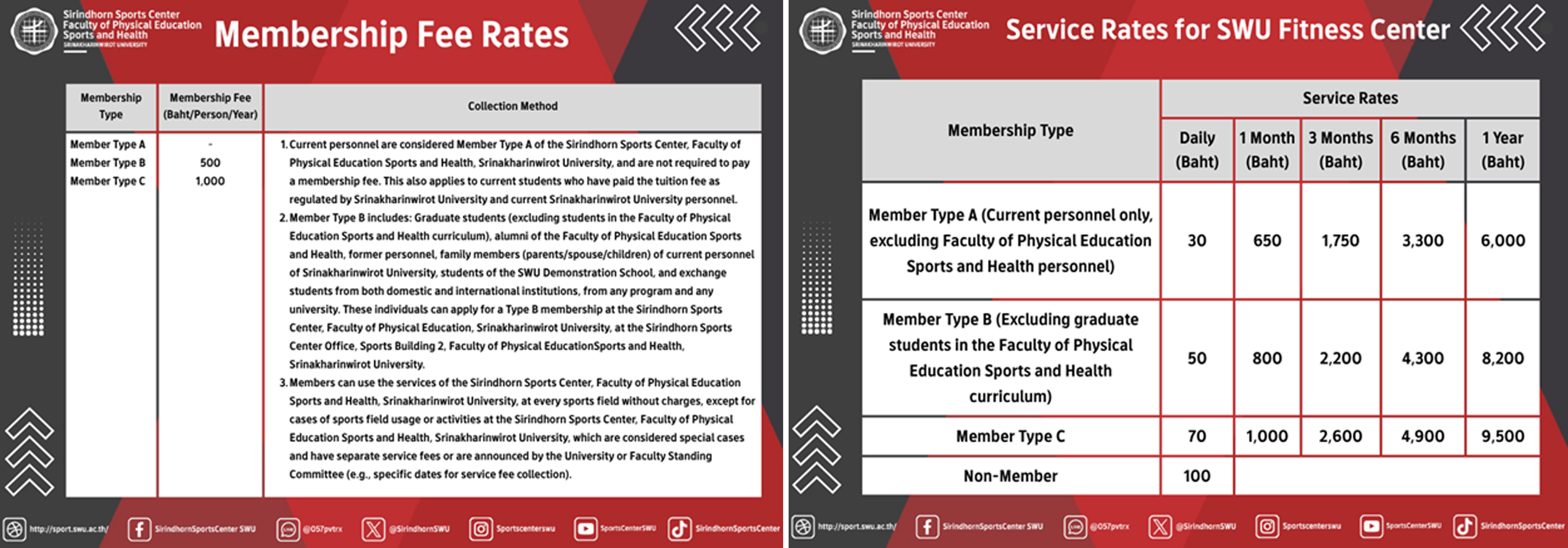 The Sirindhorn Sports Center operates on a non-profit basis, charging minimal fees for maintenance and upkeep of facilities. Its mission is to promote physical activity, recreation, and healthy lifestyles among students, staff, and surrounding communities, ensuring accessibility and inclusivity for everyone.