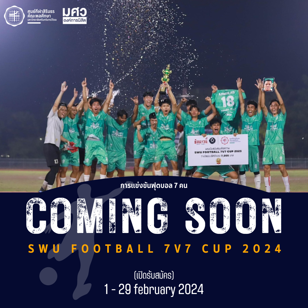 ขอเชิญชวนนิสิต มศว ผู้สนใจเข้าร่วมการแข่งขันฟุตบอลรายการ "SWU FOOTBALL 7v7 CUP 2024" ระหว่างวันที่ 18 - 29 มีนาคม 2567